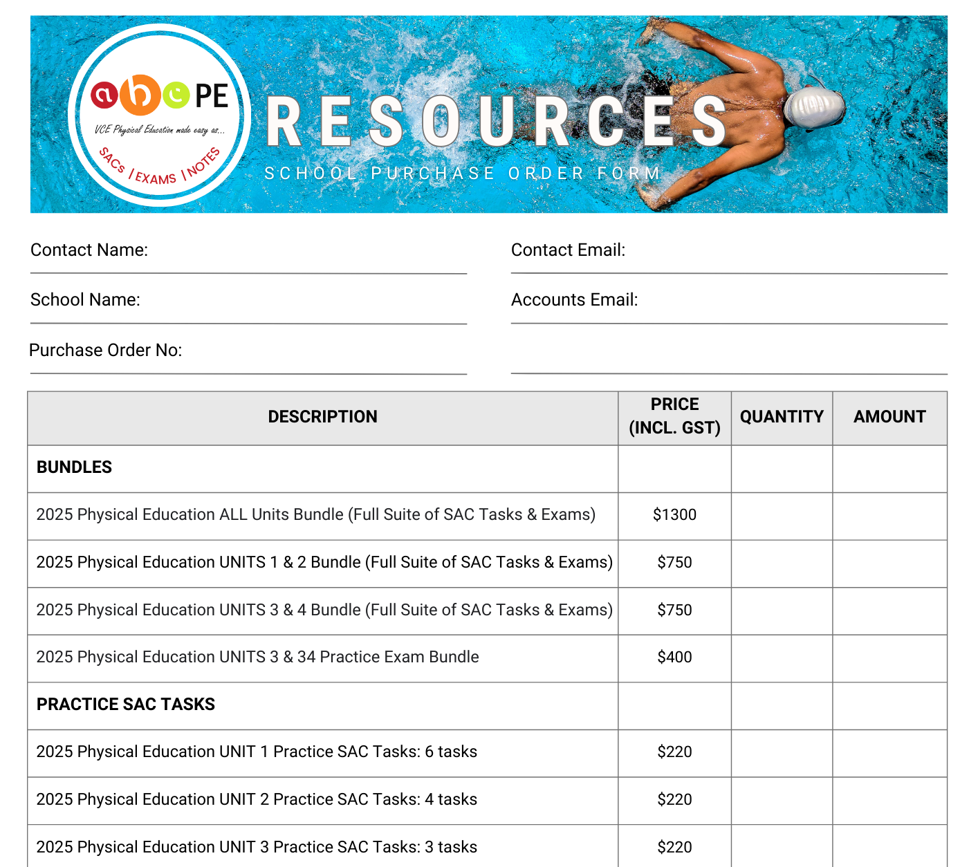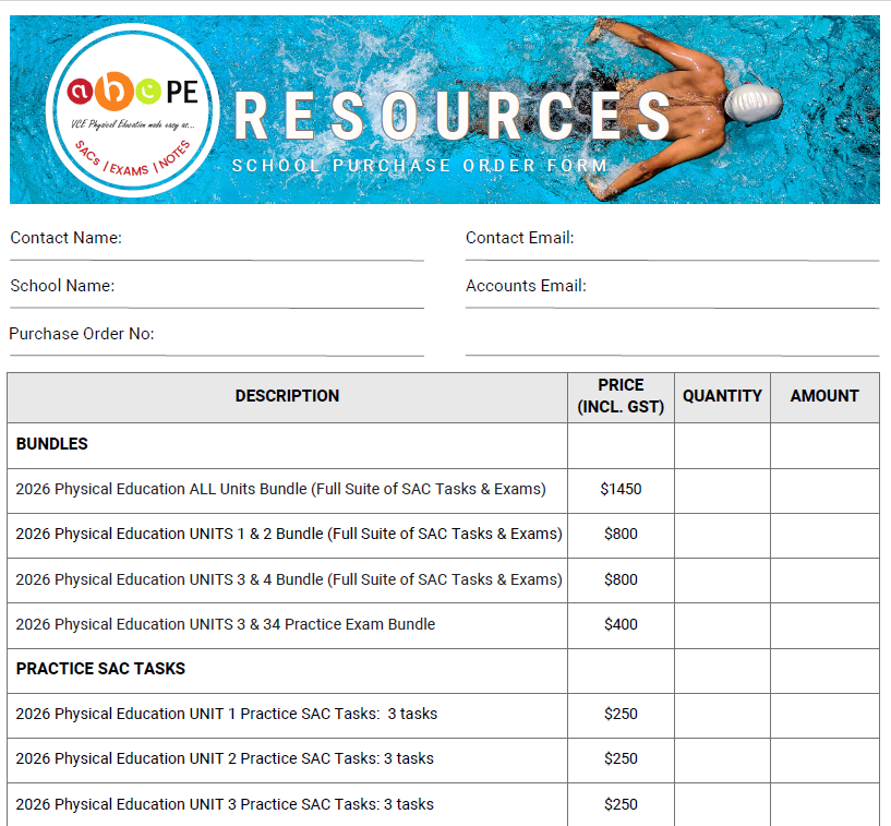 If your school would prefer to use a printable Purchase Order Form to order Resources, download the PDF version here.